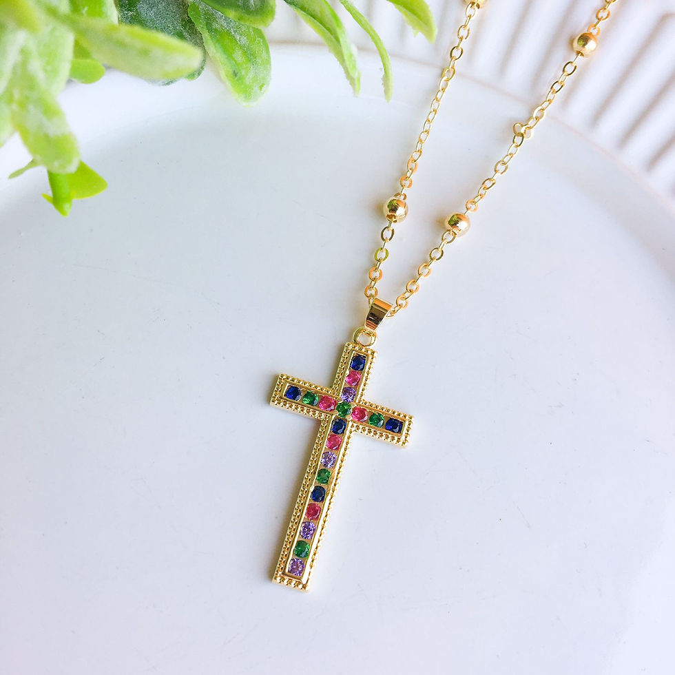Colar Perolas Placa Oval Cruz Cravejada Pai Nosso